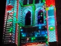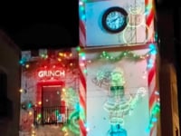 Historia navideña donde la magia de Papa Noél y el espíritu travieso del Grinch cobran vida sobre la fachada de la iglesia.