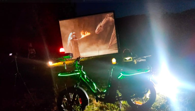 Una ecobici especialmente equipada transporta el sistema audiovisual completo (proyector, sonido, pantalla) y se alimenta principalmente con energía solar portátil, destacando un fuerte compromiso con la sostenibilidad.